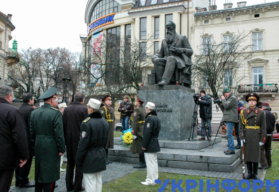 Учасники церемонії покладання квітів біля пам’ятника президенту УНР Михайлові Грушевському в День Соборності України та річниці проголошення Акта Злуки Української Народної Республіки (УНР) і Західноукраїнської Народної Республіки (ЗУНР), Львів, 22 січня 2008 року. Фото Володимира Песляка та Володимира Телюка.