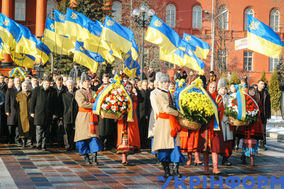 Учасники урочистостей із нагоди Дня Соборності України та 86-ї річниці проголошення Акта Злуки Української Народної Республіки (УНР) і Західноукраїнської Народної Республіки (ЗУНР) під час церемонії покладання квітів до пам’ятника Тарасові Шевченку, Київ, 22 січня 2005 року. Фото Володимира Тарасова.