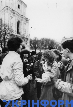 Учасників мітингу з нагоди 71-ї річниці проголошення Акта Злуки Української Народної Республіки (УНР) і Західноукраїнської Народної Республіки (ЗУНР) пригощають українським борщем на площі Богдана Хмельницького (нині Софійська), Київ, 21 січня 1990 року. Фото Анатолія Колесника.
