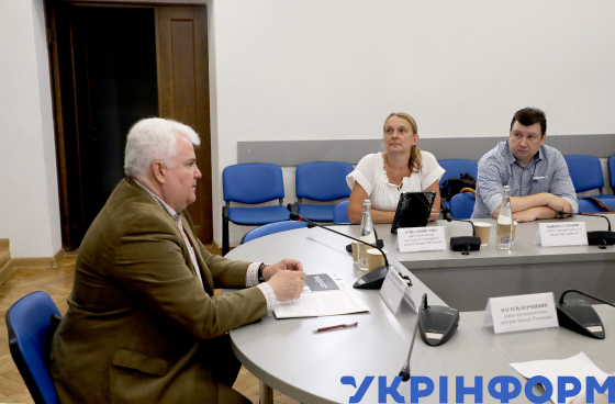Президент Центру Разумкова Юрій Якименко, провідний експерт соціальних та гендерних програм Центру Разумкова Ольга Пищуліна та доцент Академії праці та соціальних відносин Микола Судаков (зліва направо) під час фахової дискусії на тему: "Трудоресурсні виклики для відновлення України" в Українському національному інформаційному агентстві "Укрінформ", Київ, 13 червня 2024 року.