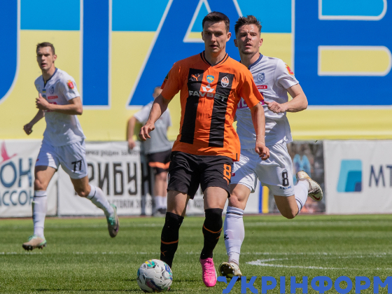 Гравці донецького ФК "Шахтар" Дмитро Крисків (на першому плані) та одеського ФК "Чорноморець" Йон Шпорн під час матчу 12-го туру чемпіонату України з футболу серед команд Премʼєр-ліги, що завершився поразкою господарів поля з рахунком 1:4, на полі стадіону "Лівий берег", Київ, 1 травня 2024 року.