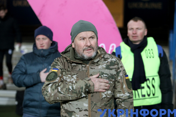 Військовослужбовець ЗСУ, спортивний журналіст Віктор Ожогін, який ввів у гру м’яч, перед початком матчу 15-го туру чемпіонату України з футболу серед команд Прем’єр-ліги між ФК "Дніпро-1" та одеським ФК "Чорноморець", що завершився перемогою господарів поля з рахунком 5:2, на стадіоні "Дніпро-Арена", Дніпро, 27 листопада 2023 року.