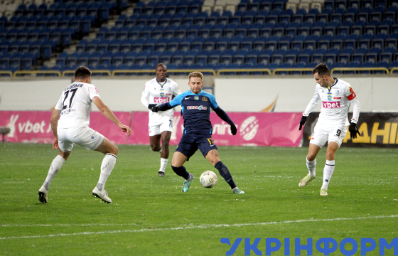 Гравець ФК "Дніпро-1" Богдан Лєднєв (у центрі) під час матчу 15-го туру чемпіонату України з футболу серед команд Прем’єр-ліги проти одеського ФК "Чорноморець", що завершився перемогою господарів поля з рахунком 5:2, на стадіоні "Дніпро-Арена", Дніпро, 27 листопада 2023 року.