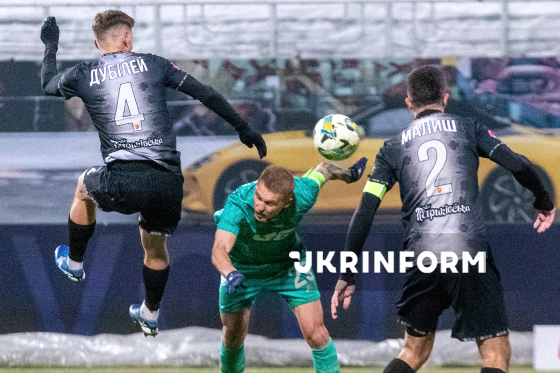 Гравці київського ФК "Динамо" Віталій Буяльський (у центрі), ФК "Інгулець" (Петрове, Кіровоградська область) Віталій Дубілей (ліворуч) та Станіслав-Нурі Малиш беруть участь у матчі 1/4 фіналу Кубка України-2025/26 з футболу, що завершився перемогою господарів з рахунком 2:0, на полі стадіону "Динамо" імені Валерія Лобановського, Київ, 3 березня 2026 року.
