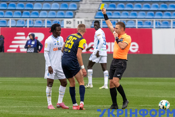 Гравці київського ФК "Динамо" Шола Огундана, харківського ФК "Металіст 1925" Іван Литвиненко та головний арбітр Віктор Копієвський (зліва направо) беруть участь у матчі 8-го туру чемпіонату України з футболу серед команд Прем’єр-ліги сезону 2025-2026, що завершився нічиєю з рахунком 1:1, на полі стадіону "Динамо" імені Валерія Лобановського, Київ, 5 жовтня 2025 року.
