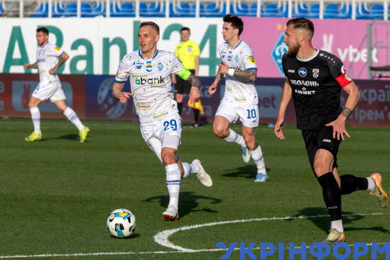 Півзахисник київського ФК "Динамо" Віталій Буяльський (ліворуч) під час матчу 25-го туру чемпіонату України з футболу серед команд Прем’єр-ліги проти ФК "Оболонь", що завершився перемогою господарів поля з рахунком 3:0, на стадіоні імені Валерія Лобановського, Київ, 18 квітня 2025 року.