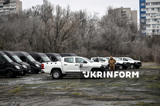 Транспорт, який демонструється в межах заходу з нагоди передачі семи позашляховиків та 17 мікроавтобусів трьом підрозділам ППО для виконання бойових завдань на Запорізькому напрямку від Запорізької ОВА разом з фондом Сергія Притули та ПрАТ "Укргідроенерго", Запоріжжя, 12 лютого 2026 року.