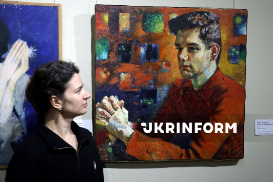 Художниця, засновниця та очільниця Благодійної організації "Фонд Алли Горської та Віктора Зарецького", співкураторка виставки "Віктор Зарецький. 100", онука художників-шістдесятників Алли Горської та Віктора Зарецького Олена Зарецька позує для фото біля картини "Портрет юнака. Олексій Зарецький", представленої на виставці "Віктор Зарецький. 100" у Національному музеї Тараса Шевченка, під час інтерв`ю кореспонденту Українського національного інформаційного агентства "Укрінформ", Київ, 6 листопада 2025 року.