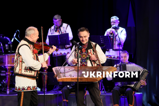 Цимбаліст Костянтин Борух виступає під час спільного концерту оркестру народних інструментів Івано-Франківського національного академічного ансамблю пісні і танцю “Гуцулія” Hutsulia Orchestra з народними артистами України Любомиром Матейком та Олесем Журавчаком на сцені Івано-Франківської обласної філармонії імені Іри Маланюк, Івано-Франківськ, 20 березня 2026 року.