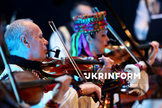 Оркестр народних інструментів Івано-Франківського національного академічного ансамблю пісні і танцю “Гуцулія” Hutsulia Orchestra виступає під час спільного концерту з народними артистами України Любомиром Матейком та Олесем Журавчаком на сцені Івано-Франківської обласної філармонії імені Іри Маланюк, Івано-Франківськ, 20 березня 2026 року.