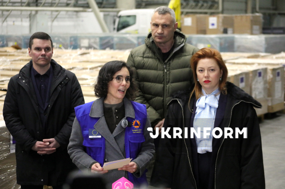 Заступник міністра розвитку громад та територій України Костянтин Ковальчук, європейський комісар з питань готовності, управління кризовими ситуаціями та рівності Аджа Лябіб, міський голова Києва Віталій Кличко, перша заступниця міністра розвитку громад та територій України Альона Шкрум (зліва направо) беруть участь у передачі Києву другої партії автономних джерел живлення (234 генераторів), наданих зі стратегічного резервузасобів цивільного захисту Європейського Союзу rescEU, Київ, 12 лютого 2026 року. Столиця отримала повну партію – 500 генераторів для забезпечення тепла та водопостачання у житлових будинках. Обладнання забезпечуватиме роботу теплових пунктів, а також водяних і каналізаційних насосів.