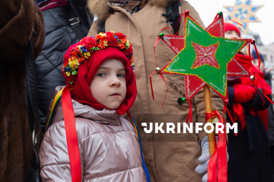 Юна учасниця бере участь у зібранні звіздарів на Михайлівській площі біля Михайлівського Золотоверхого монастиря перед початком Різдвяної ходи з зірками центром столиці, організованої з метою продовження давніх українських традицій, підтримки одне одного в умовах війни та вшанування пам’яті полеглих українських захисників, Київ, 25 грудня 2025 року.