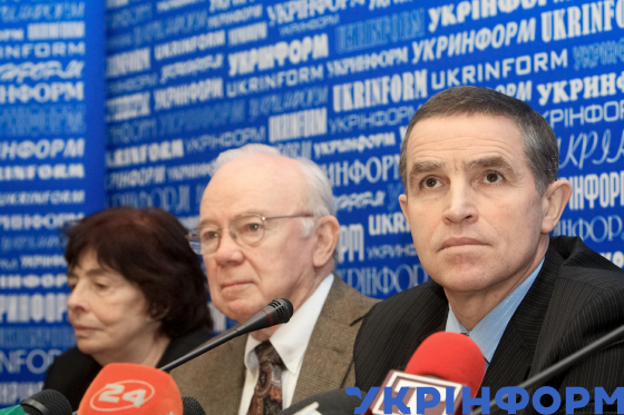 Керівники наукових україно-американських експериментів Єлизавета Курдюм, Дейв Чепмен (США) (зліва направо) в Національному інформаційному агентстві "Укрінформ" на пресконференції з нагоди 10-ї річниці польоту першого космонавта незалежної України Леоніда Каденюка (праворуч) у складі екіпажу міжнародного космічного корабля "Колумбія", Київ, 23 листопада 2007 року. Фото Павла Багмута.