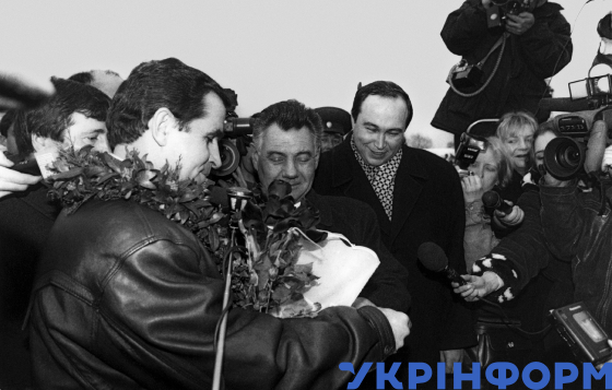 Першого космонавта незалежної України Леоніда Каденюка (ліворуч) після завершення польоту у складі екіпажу міжнародного космічного корабля "Колумбія" зустрічає в аеропорту "Бориспіль" голова міської держадміністрації Олександр Омельченко (у центрі) та вручає ордер на квартиру, Київ, 12 січня 1998 року. Фото Володимира Самохоцького.