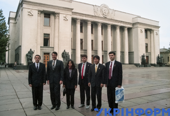 Перший космонавт незалежної України Леонід Каденюк (ліворуч) та інші члени екіпажу міжнародного космічного корабля "Колумбія" на чолі з командиром Кевіном Крігелем (другий ліворуч) позують для фото біля Верховної Ради України, Київ, вересень 1998 року. Фото Юрія Ільєнка.