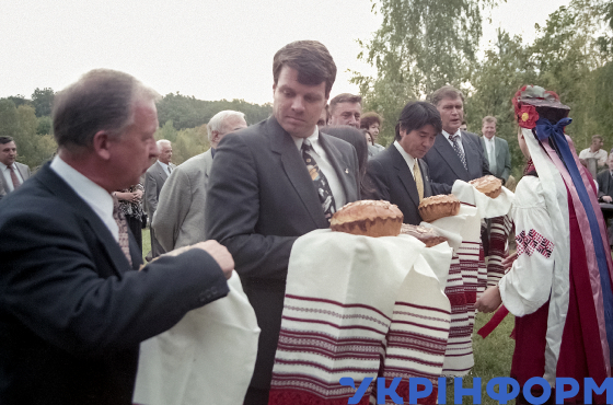 Американські гості – члени екіпажу міжнародного космічного корабля "Колумбія", у складі якого Леонід Каденюк здійснив свій політ, на чолі з командиром Кевіном Крігелем (у центрі) відвідали Національний музей народної архітектури та побуту України в Пирогові, Київ, 14 вересня 1998 року. Фото Юрія Ільєнка.
