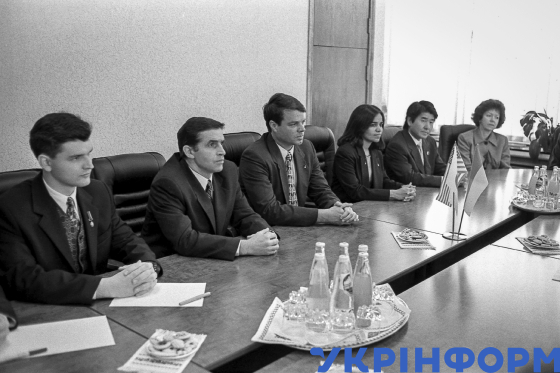 Перший космонавт незалежної України Леонід Каденюк (другий ліворуч) та інші члени екіпажу міжнародного космічного корабля "Колумбія" на чолі з командиром Кевіном Крігелем (третій ліворуч) під час пресконференції в Національному космічному агентстві України, Київ, 14 вересня 1998 року. Фото Юрія Ільєнка.