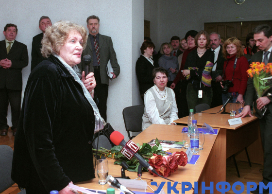 Видатна українська поетеса Ліна Костенко виступає з промовою під час "круглого столу" на тему: "Поезія Ліни Костенко в часах перехідних і вічних", який відбувся в Національному університеті "Києво-Могилянська академія", Київ, 18 березня 2005 року. Фото Олега Диканя.