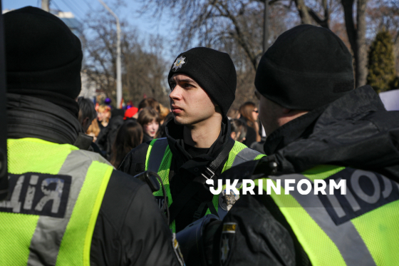 Правоохоронці забезпечують громадський правопорядок під час Маршу жінок, присвяченого боротьбі з ґендерною дискримінацією та захисту прав жінок, з метою зосередити увагу на правах жінок-військових, необхідності боротьби з сексуальними домаганнями та дискримінацією у Збройних силах України, а також на підтримці жінок, які перебувають у російському полоні, у парку імені Тараса Шевченка, Київ, 8 березня 2026 року.