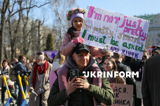 Дівчинка сидить на плечах у чоловіка, демонструючи плакат із гаслом, під час Маршу жінок, присвяченого боротьбі з ґендерною дискримінацією та захисту прав жінок, з метою зосередити увагу на правах жінок-військових, необхідності боротьби з сексуальними домаганнями та дискримінацією у Збройних силах України, а також на підтримці жінок, які перебувають у російському полоні, у парку імені Тараса Шевченка, Київ, 8 березня 2026 року.