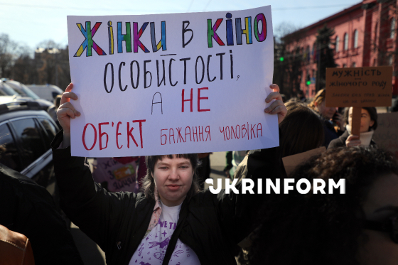 Учасниця Маршу жінок, присвяченого боротьбі з ґендерною дискримінацією та захисту прав жінок, з метою зосередити увагу на правах жінок-військових, необхідності боротьби з сексуальними домаганнями та дискримінацією у Збройних силах України, а також на підтримці жінок, які перебувають у російському полоні, демонструє плакат із гаслом на вулиці Володимирській, Київ, 8 березня 2026 року.
