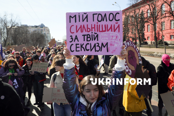 Учасниця Маршу жінок, присвяченого боротьбі з ґендерною дискримінацією та захисту прав жінок, з метою зосередити увагу на правах жінок-військових, необхідності боротьби з сексуальними домаганнями та дискримінацією у Збройних силах України, а також на підтримці жінок, які перебувають у російському полоні, демонструє плакат із гаслом у парку імені Тараса Шевченка, Київ, 8 березня 2026 року.