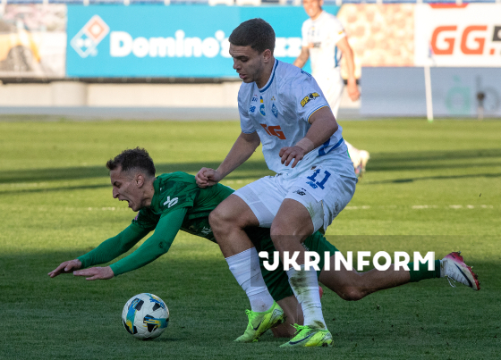 Півзахисник ФК “Карпати” Ян Костенко, нападник ФК “Динамо” Матвій Пономаренко борються за м`яч під час матчу 22-туру чемпіонату України з футболу серед команд Прем`єр-ліги між ФК “Динамо” (Київ) і ФК “Карпати” (Львів), що завершився з рахунком 0:1 на користь львів`ян, на стадіоні “Динамо” імені Валерія Лобановського, Київ, 4 квітня 2026 року.