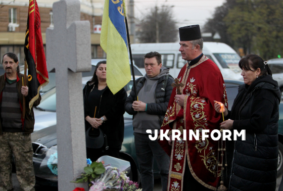 Священник православної Греко-католицької церкви, настоятель храму Покрови Пресвятої Богородиці Василь Колодій очолює молебень за українцями, які стали жертвами геноциду у часи радянської влади, під час мітингу-реквієму, організованого активом Дніпровського товариства політичних в’язнів і репресованих до Дня пам’яті жертв голодоморів, біля пам’ятного знаку на Вокзальній площі, Дніпро, 22 листопада 2025 року.