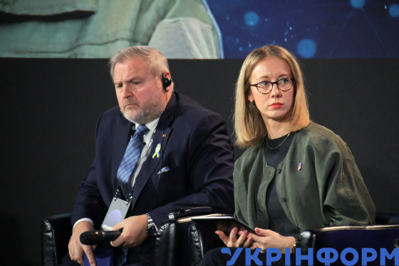 Депутат Європарламенту, віцеголова комітету з безпеки та оборони Ріго Террас, депутат Європарламенту, член комітету з безпеки та оборони Луція Яр під час дискусійної панелі “Космос як стратегічний ресурс та цивілізаційна ознака сучасної держави” на міжнародному форумі Space For Ukraine, організованому Міністерством оборони України, Київ, 29 березня 2025 року.