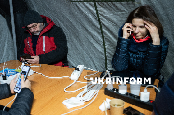 Кияни заряджають телефони, лампи, ліхтарі та п`ють теплі напої у мобільному пункті незламності від Державної служби надзвичайних ситуацій України, розгорнутому у житловому масиві Русанівка у зв`язку з перебоями з електропостачанням та опаленням після чергових масованих атак РФ на енергосистему України, Київ, 18 січня 2026 року.