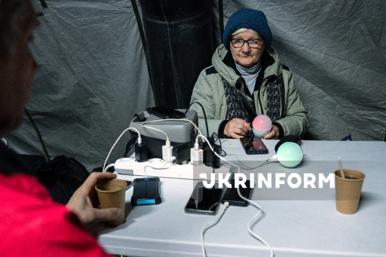 Кияни заряджають телефони та п`ють теплі напої у мобільному пункті незламності від Державної служби надзвичайних ситуацій України, розгорнутому у житловому масиві Русанівка у зв`язку з перебоями з електропостачанням та опаленням після чергових масованих атак РФ на енергосистему України, Київ, 18 січня 2026 року.