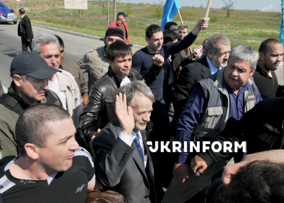Лідер кримських татар, народний депутат України Мустафа Джемілєв (другий ліворуч) вітає співвітчизників на контрольно-пропускному пункті під час зустрічі свого лідера, якому влада російської федерації заборонила в’їзд на територію півострова, Армянськ, АР Крим, 3 травня 2014 року. Фото Арвідаса Шеметаса.