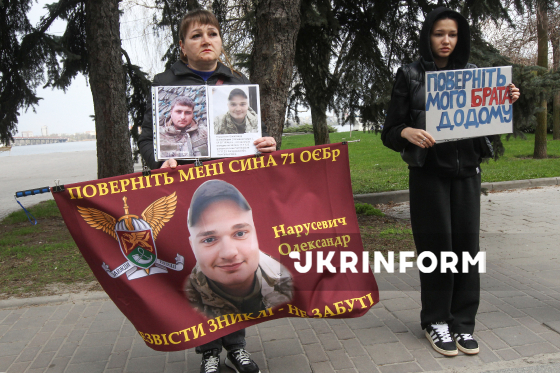 Учасники акції-нагадування про військовополонених, всіх полонених і зниклих безвісти захисників України “Не мовчи, стань голосом полонених!" тримають плакати та прапори з портретами військових на вулиці Січеславська Набережна у Дніпрі, 4 квітня 2026 року.