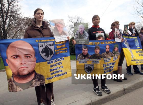 Учасники акції-нагадування про військовополонених, всіх полонених і зниклих безвісти захисників України “Не мовчи, стань голосом полонених!" тримають плакати та прапори з портретами військових на вулиці Січеславська Набережна у Дніпрі, 4 квітня 2026 року.