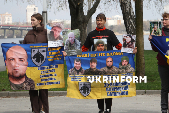 Учасники акції-нагадування про військовополонених, всіх полонених і зниклих безвісти захисників України “Не мовчи, стань голосом полонених!" тримають плакати та прапори з портретами військових на вулиці Січеславська Набережна у Дніпрі, 4 квітня 2026 року.