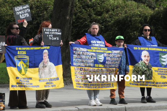 Учасники акції-нагадування про військовополонених, всіх полонених і зниклих безвісти захисників України “Не мовчи, стань голосом полонених!" тримають плакати та прапори з портретами військових на вулиці Січеславська Набережна у Дніпрі, 4 квітня 2026 року.