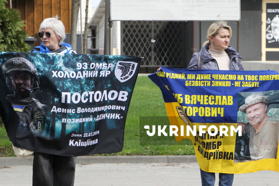 Учасники акції-нагадування про військовополонених, всіх полонених і зниклих безвісти захисників України “Не мовчи, стань голосом полонених!" тримають плакати та прапори з портретами військових на вулиці Січеславська Набережна у Дніпрі, 4 квітня 2026 року.