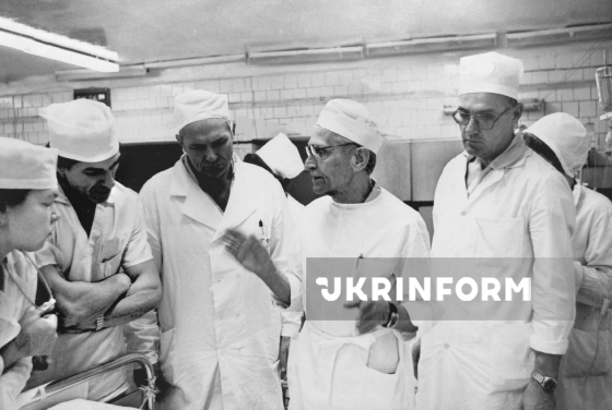 Старший науковий працівник відділу реанімації Андрій Говенко, професор Геннадій Книшов, кардіохірург, академік НАН України Микола Амосов та завідувач відділу реанімації Олександр Ваднєв (зліва направо) приймають важливе рішення в операційній Київського науково-дослідного інституту серцево-судинної хірургії, Київ, листопад 1988 року. Фото Валерія Соловйова.