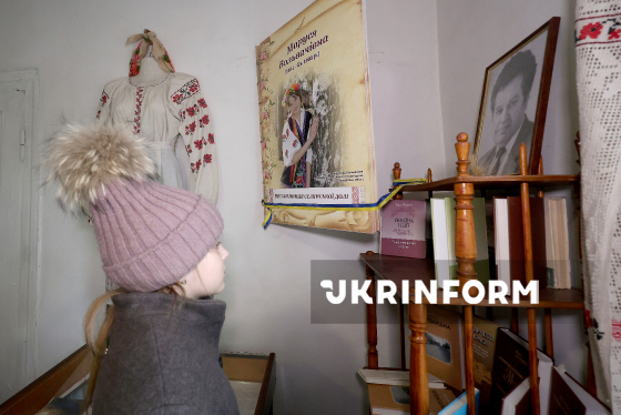 Дівчинка роздивляється експонати в музеї Марусі Вольвачівни та історії села Черемушна, де відбувся захід з нагоди відзначення 185-річчя від дня народження поетеси, письменниці, громадсько-культурної діячки Марусі Вольвачівни (Марії Вольвач), Черемушна, Харківська область, 27 березня 2026 року.