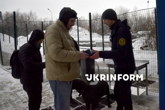 Співробітник митної служби перевіряє в чоловіка документи в пункті пропуску "Ужгород - Вишнє Нємецьке", що на кордоні зі Словаччиною, де запрацював пішохідний перехід, Закарпатська область, 14 січня 2026 року. Перехід для пішоходів та велосипедистів відкрили завдяки набранню чинності Протоколу між урядами України та Словацької Республіки, який був підписаний у жовтні 2025 року з метою розвантаження пунктів пропуску та покращення мобільності громадян.