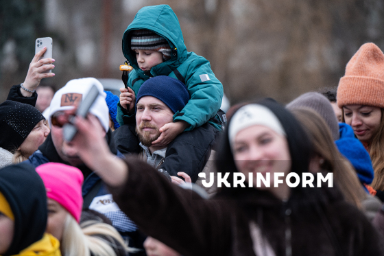 Кияни фотографують і знімають на відео виступ диджея Дмитра Чубакова і співака Юрія Звонаря, організований для жителів міста на Льодовому стадіоні біля станції Київського метрополітену “Іподром”, Київ, 15 лютого 2026 року. Для багатьох жителів Києва спонтанні та організовані вечірки просто неба стали можливостю відпочити, зігрітися і зняти стрес в умовах російських масованих обстрілів і перебоїв зі світло- та теплопостачанням.