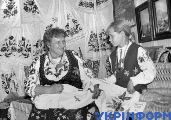 Народна майстриня декоративно-прикладного мистецтва Любов Вірченко із внучкою Ганнусею на відкритті виставки "Перлини Кремінського краю", Кремінський (нині Сватівський, тимчасово окупований) район, Луганська область, січень 2000 року. Фото Вадима Лісного.