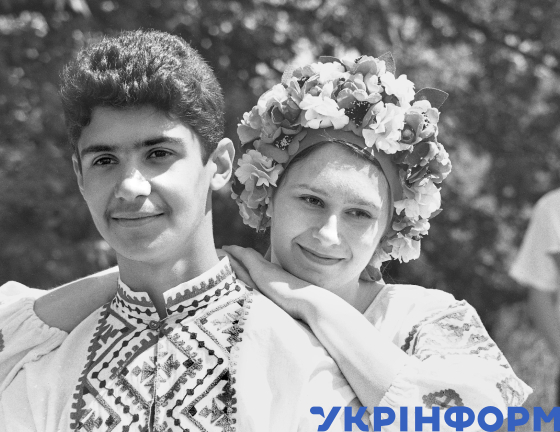 Солісти народного ансамблю танцю "Веселка", старшокласники Старобільської середньої школи № 1 Оксана Ткаченко та Василь Реверун на фольклорному святі, Старобільськ (нині тимчасово окупований), Луганська область, серпень 1998 року. Фото Вадима Лісного.