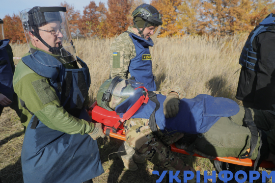 Учасники навчань з гуманітарного розмінування для ветеранів, які отримали поранення або були звільнені з військової служби, що фінансуються за підтримки Республіки Словенія, у межах яких відпрацювали алгоритм дій сапера, ручне розмінування, роботу з НРК, а також план реагування на нещасний випадок при роботі з вибухонебезпечними предметами та надання першої невідкладної допомоги, несуть на ношах умовного потерпілого, Київ, 30 жовтня 2025 року.