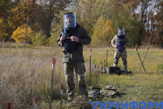 Учасники навчань з гуманітарного розмінування для ветеранів, які отримали поранення або були звільнені з військової служби, що фінансуються за підтримки Республіки Словенія, у межах яких відпрацювали алгоритм дій сапера, ручне розмінування, роботу з НРК, а також план реагування на нещасний випадок при роботі з вибухонебезпечними предметами та надання першої невідкладної допомоги, Київ, 30 жовтня 2025 року.