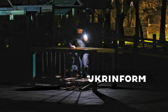 Жінка з дитиною при світлі ліхтарика гуляють на дитячому майданчику, Одеса, 13 грудня 2025 року. Після масованої російської атаки на енергетичні об’єкти 13 грудня більша частина Одеси залишилася без електроенергії, водопостачання та опалення. Магазини, лікарні і решта важливих об’єктів життєзабезпечення наразі працюють на альтернативних джерелах енергії. Незважаючи на серйозні пошкодження інфраструктури, місто продовжує жити і працювати.