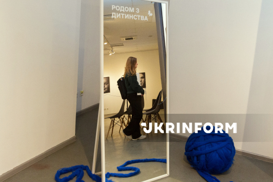 Відображення у дзеркалі відвідувачки виставки "Ниточка: Трансформація замість зламаності" - спільного проєкту БФ "Голоси дітей" та фотографині Марти Сирко, присвяченого дитячому досвіду війни, - до четвертих роковин повномасштабного російського вторгнення в Україну, Київ, 19 лютого 2026 року.