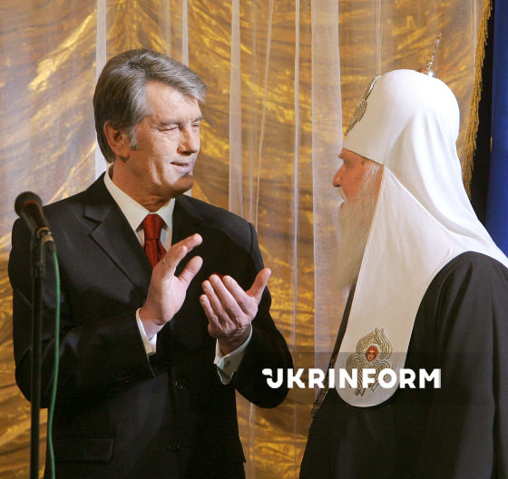 Президент України Віктор Ющенко (ліворуч) привітав Патріарха Київського і всієї Руси-України, Предстоятеля Української православної церкви Київського патріархату (УПЦ КП) Філарета із 80-річним ювілеєм та вручив орден Свободи за багатолітню плідну церковну діяльність, Київ, 23 січня 2009 року. Фото Миколи Лазаренка.
