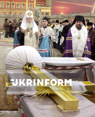 Предстоятель Української православної церкви Київського патріархату (УПЦ КП), Патріарх Київський і всієї Руси-України Філарет (ліворуч) освячує один із хрестів перед встановленням на баню та дзвіницю відтвореної церкви Різдва Христового на Поштовій площі, Київ, 6 січня 2003 року. Фото Володимира Фаліна.