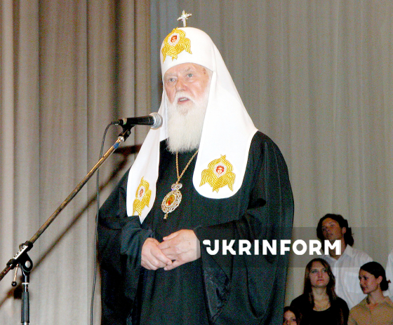 Предстоятель Української Православної церкви Київського патріархату (УПЦ КП), Патріарх Київський і всієї Руси-України Філарет бере участь в урочистій посвяті у студенти першокурсників – майбутніх педагогів, що відбулась у Міжнародному центрі культури і мистецтв, Київ, 1 вересня 2004 року. Фото Володимира Самохоцького.